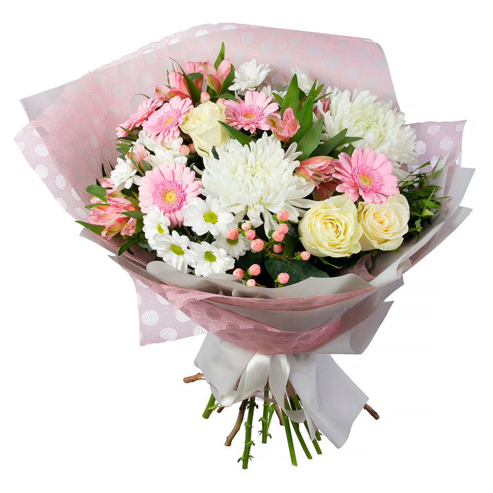Роза одноголовая, гербера, хризантема кустовая, альстромерия, хризантема одноголовая, гиперикум.